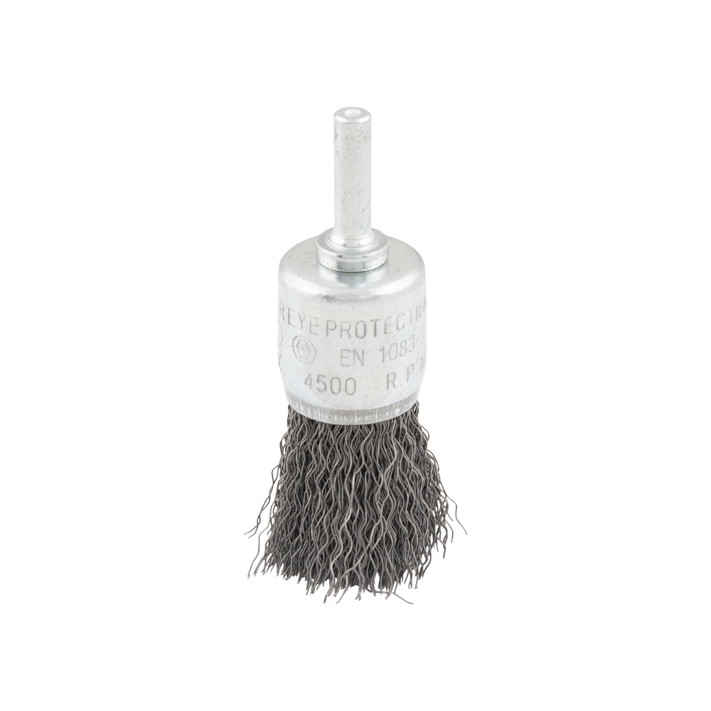 Stalen borstel met gegolfde staaldraad voor gebruik op rechte slijpmachines en boren.